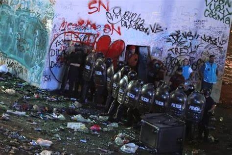 En el momento en que la mayoría de los hinchas empezaron a dejar el lugar, unos pocos agresores comenzaron a lanzar piedras y botellas al sector donde los uniformados se encontraban, los cuales respondieron disparando con balas de goma.
